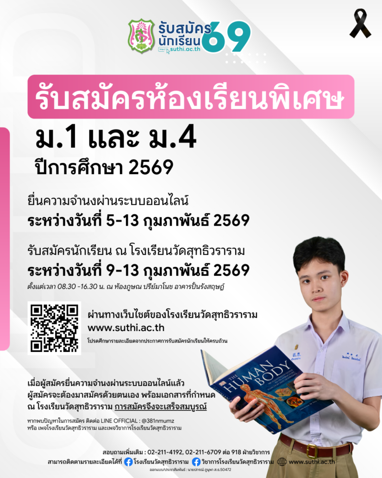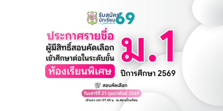 Update – ปฏิทินการรับนักเรียนใหม่ ม.1 และ ม.4 ปีการศึกษา 256921 มกราคม 2026Written by กลุ่มบริหารวิชาการ รับสมัครนักเรียน 2569 รับสมัครนักเรียนใหม่ประกาศรายชื่อผู้มีสิทธิ์สอบคัดเลือกเข้าศึกษาต่อ – ม.1 ประเภทห้องเรียนพิเศษประกาศเกี่ยวกับการคุ้มครองข้อมูลส่วนบุคคล ต …อ่านเพิ่มเติม 18 กุมภาพันธ์ 2026 ‒ กลุ่มบริหารวิชาการ รับสมัครนักเรียนใหม่ประกาศรายชื่อผู้มีสิทธิ์สอบคัดเลือกเข้าศึกษาต่อ – ม.4 ประเภทห้องเรียนพิเศษประกาศเกี่ยวกับการคุ้มครองข้อมูลส่วนบุคคล ต …อ่านเพิ่มเติม 17 กุมภาพันธ์ 2026 ‒ กลุ่มบริหารวิชาการ รับสมัครนักเรียนใหม่🎓 โอกาสสุดท้ายในการสมัครห้องเรียนพิเศษ ม.1 และ ม.4ปีการศึกษา 2569 …อ่านเพิ่มเติม 13 กุมภาพันธ์ 2026 ‒ กลุ่มบริหารวิชาการ รับสมัครนักเรียนใหม่ตารางสอบ – คัดเลือกนักเรียน ม.4 ประเภทห้องเรียนพิเศษตารางสอบม4ห้องเรียนพิเศษปี69(1)ดาวน์โหลด …อ่านเพิ่มเติม 9 กุมภาพันธ์ 2026 ‒ กลุ่มบริหารวิชาการ รับสมัครนักเรียนใหม่ตารางสอบ – คัดเลือกนักเรียน ม.1 ประเภทห้องเรียนพิเศษตารางสอบม1ห้องเรียนพิเศษปี69(1)ดาวน์โหลด …อ่านเพิ่มเติม 9 กุมภาพันธ์ 2026 ‒ กลุ่มบริหารวิชาการ รับสมัครนักเรียนใหม่เปิดรับสมัครนักเรียนห้องเรียนพิเศษ ม.1 และ ม.4 ปีการศึกษา 2569 แล้ว!!!ระบบรับสมัครนักเรียนใหม่ ปีการศึกษา 2569 รา …อ่านเพิ่มเติม 5 กุมภาพันธ์ 2026 ‒ กลุ่มบริหารวิชาการ ยอดผู้เข้าชม : 1,595