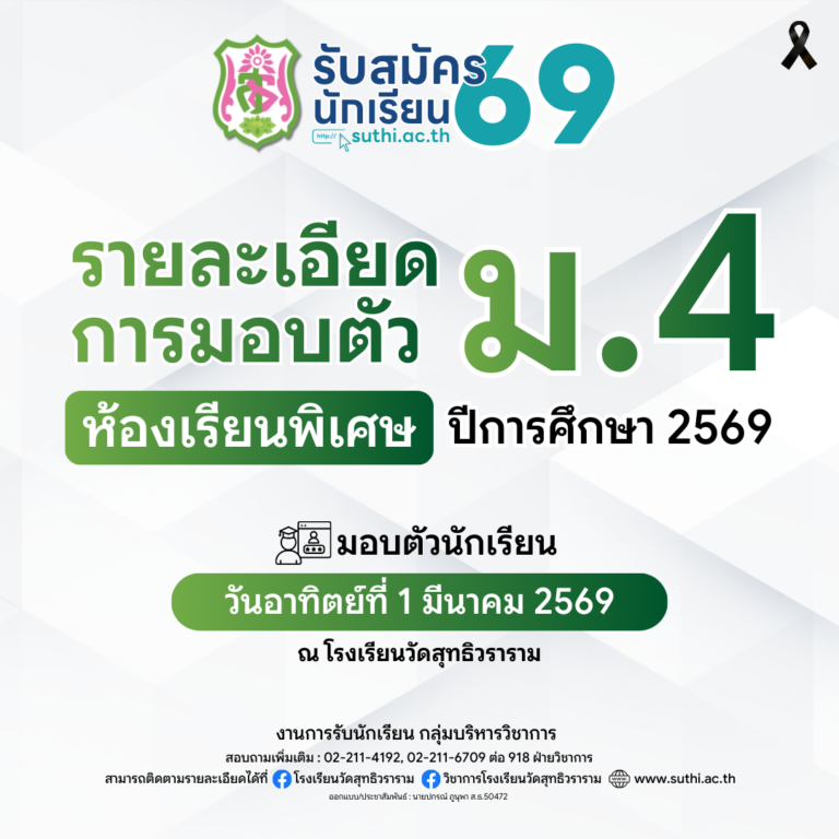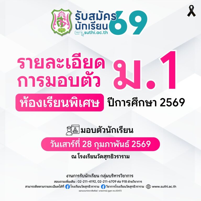 Update – ปฏิทินการรับนักเรียนใหม่ ม.1 และ ม.4 ปีการศึกษา 256921 มกราคม 2026Written by กลุ่มบริหารวิชาการ รับสมัครนักเรียน 2569 รับสมัครนักเรียนใหม่แบบฟอร์ม – หนังสือคำร้องกรณีนักเรียนพักอาศัยอยู่ในเขตพื้นที่บริการ ของผู้สมัครเข้าศึกษาต่อ ม.1 ปีการศึกษา 2569แบบฟอร์ม – หนังสือคำร้องกรณีนักเรียนพักอาศั …อ่านเพิ่มเติม 12 มีนาคม 2026 ‒ กลุ่มบริหารวิชาการ รับสมัครนักเรียนใหม่ประกาศ เรื่อง การรับนักเรียนชั้นมัธยมศึกษาปีที่ 4 ปีการศึกษา 2569 ประเภทห้องเรียนพิเศษ (เพิ่มเติม)ประกาศโรงเรียนวัดสุทธิวรารามเรื่อง การรับนั …อ่านเพิ่มเติม 4 มีนาคม 2026 ‒ กลุ่มบริหารวิชาการ รับสมัครนักเรียนใหม่ประกาศ เรื่อง การรับนักเรียนชั้นมัธยมศึกษาปีที่ 1 ปีการศึกษา 2569 ประเภทห้องเรียนพิเศษ (เพิ่มเติม)ประกาศโรงเรียนวัดสุทธิวรารามเรื่อง การรับนั …อ่านเพิ่มเติม 4 มีนาคม 2026 ‒ กลุ่มบริหารวิชาการ รับสมัครนักเรียนใหม่รายละเอียดการมอบตัวนักเรียน – ห้องเรียนพิเศษ ระดับชั้น ม.4 ปีการศึกษา 2568 …อ่านเพิ่มเติม 27 กุมภาพันธ์ 2026 ‒ กลุ่มบริหารงบประมาณ รับสมัครนักเรียนใหม่ประกาศผลผู้ผ่านการสอบคัดเลือกเข้าศึกษาต่อ – ม.4 ประเภทห้องเรียนพิเศษประกาศเกี่ยวกับการคุ้มครองข้อมูลส่วนบุคคล ต …อ่านเพิ่มเติม 27 กุมภาพันธ์ 2026 ‒ กลุ่มบริหารวิชาการ รับสมัครนักเรียนใหม่รายละเอียดการมอบตัวนักเรียน – ห้องเรียนพิเศษ ระดับชั้น ม.1 ปีการศึกษา 2568 …อ่านเพิ่มเติม 26 กุมภาพันธ์ 2026 ‒ กลุ่มบริหารงบประมาณ ยอดผู้เข้าชม : 1,945