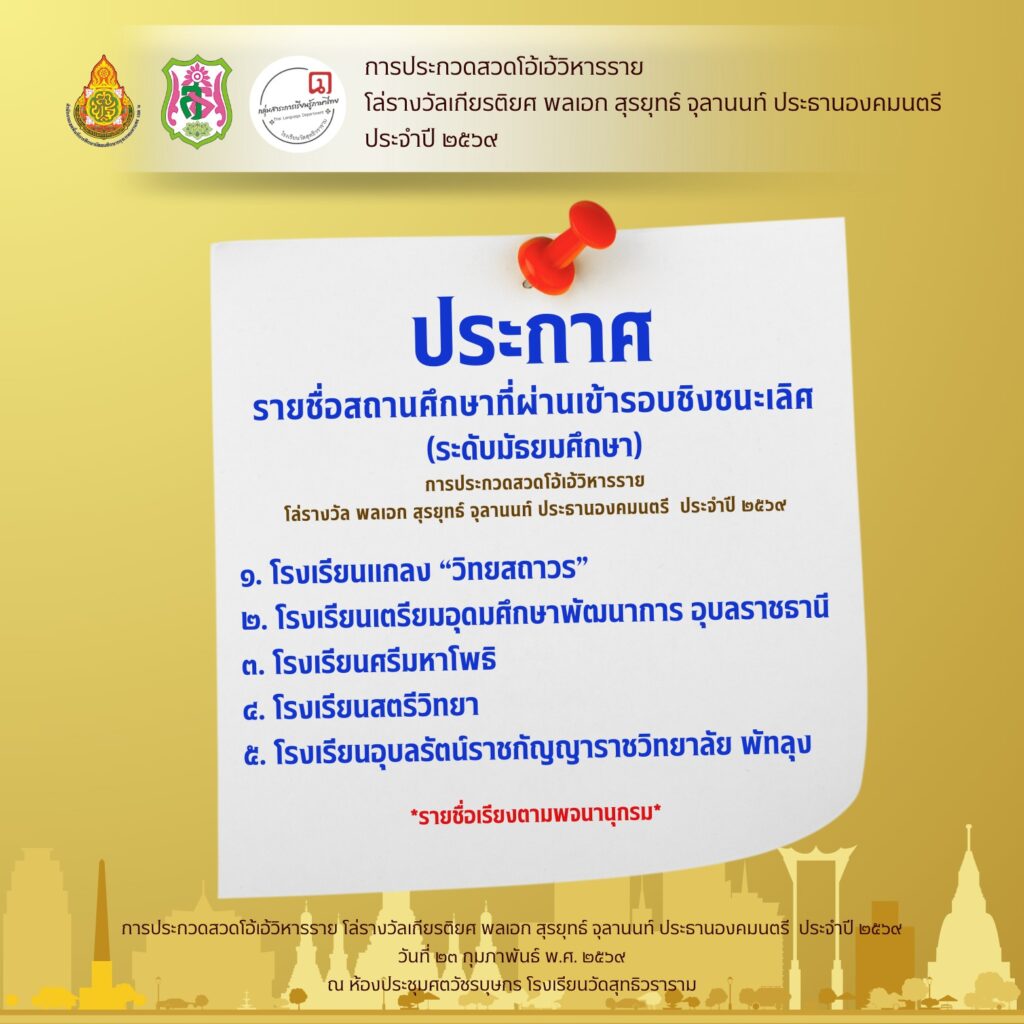 ประกวดสวดโอ้เอ้วิหารราย โล่รางวัล พลเอกสุรยุทธ์ จุลานนท์ ประธานองคมนตรี ประจำปี ๒๕๖๙