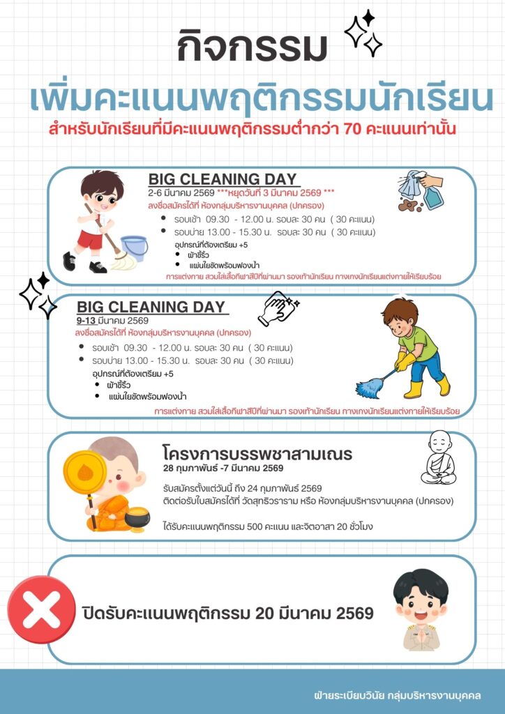 กิจกรรมเพิ่มคะแนนพฤติกรรม สำหรับนักเรียนที่มีคะแนนพฤติกรรมต่ำกว่า 70 คะแนน