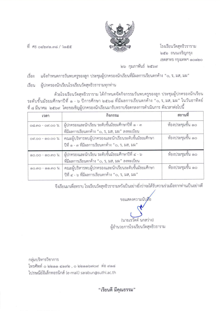 หนังสือแจ้งผู้ปกครอง เรื่อง แจ้งกำหนดการวันพบครูของลูก ประชุมผู้ปกครองนักเรียนที่มีผลการเรียนตกค้าง “๐, ร, มส, มผ”5 มีนาคม 2026Written by กลุ่มบริหารวิชาการ ยอดผู้เข้าชม : 14
