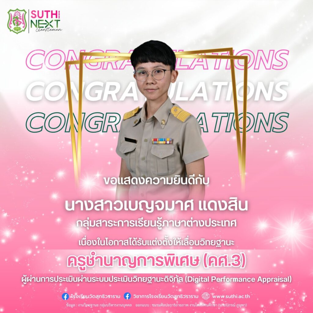 นางสาวเบญจมาศ แดงสิน ได้รับการแต่งตั้งให้เลื่อนวิทยฐานะผ่านระบบประเมินวิทยฐานะดิจิทัล (DPA) ครูชำนาญการพิเศษ (คศ.3)17 เมษายน 2026Written by Administrator ยอดผู้เข้าชม : 10