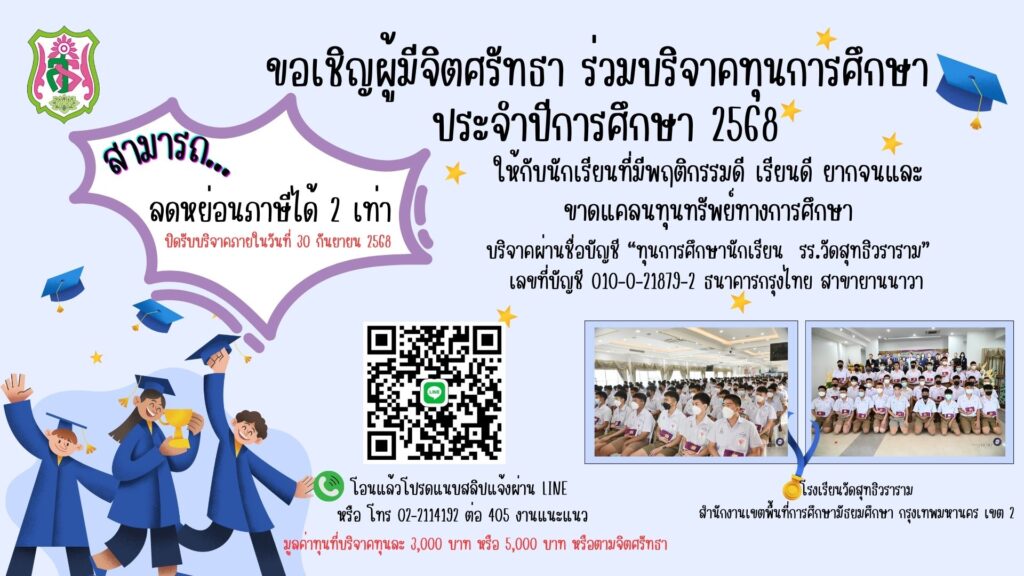 ขอเชิญผู้มีจิตศรัทธา ร่วมบริจาคทุนการศึกษา ประจำปีการศึกษา 25684 กรกฎาคม 2025Written by กลุ่มบริหารวิชาการ