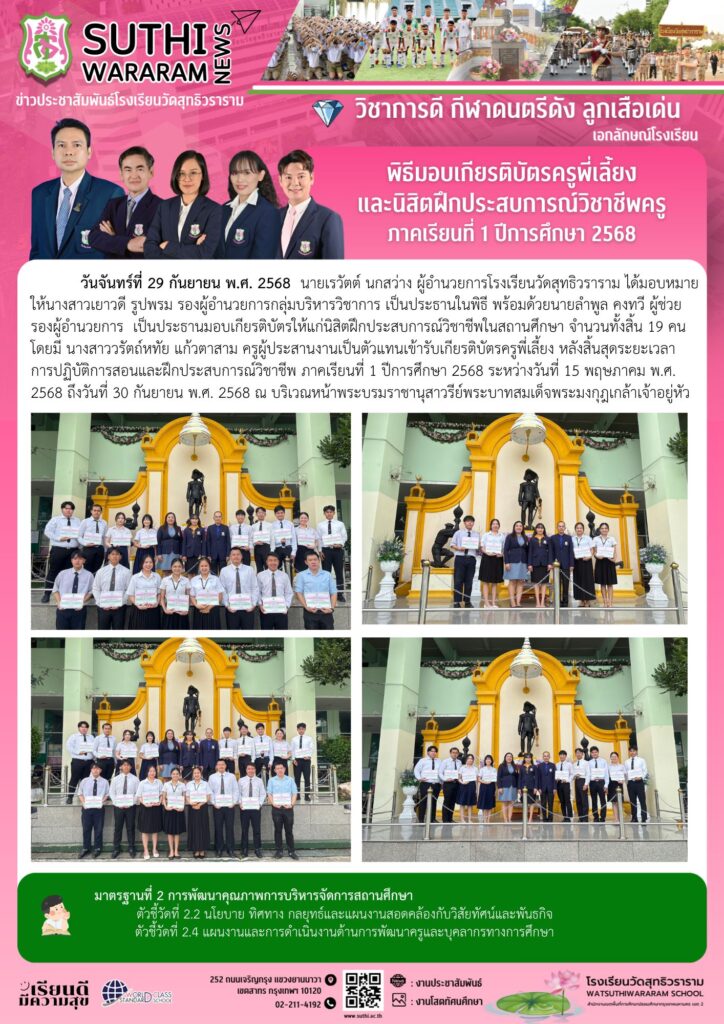 พิธีมอบเกียรติบัตรครูพี่เลี้ยง และนิสิตฝึกประสบการณ์วิชาชีพครู ภาคเรียนที่ 1 ปีการศึกษา 256829 กันยายน 2025Written by งานประชาสัมพันธ์