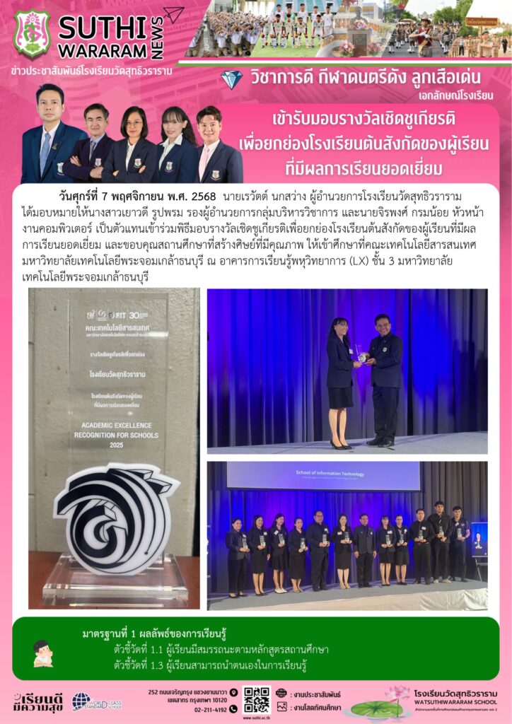 เข้ารับมอบรางวัลเชิดชูเกียรติ เพื่อยกย่องโรงเรียนต้นสังกัดของผู้เรียน ที่มีผลการเรียนยอดเยี่ยม7 พฤศจิกายน 2025Written by งานประชาสัมพันธ์ ยอดผู้เข้าชม : 14