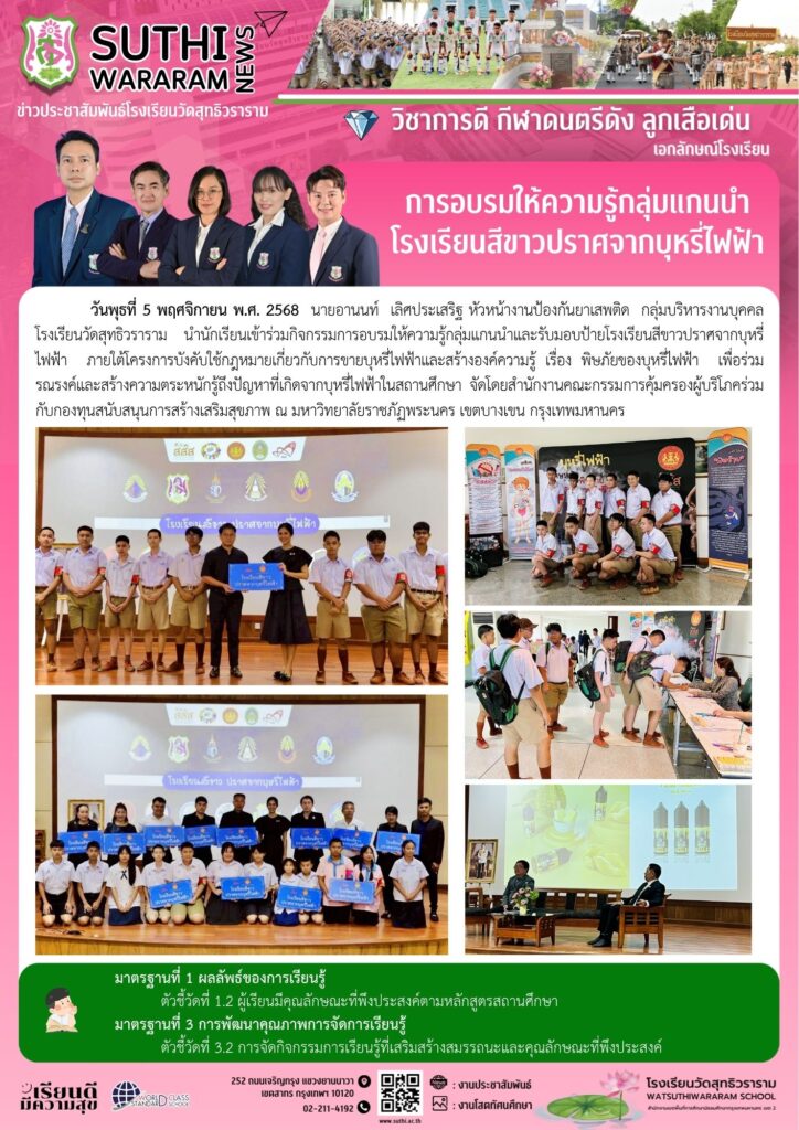 การอบรมให้ความรู้กลุ่มแกนนำโรงเรียนสีขาวปราศจากบุหรี่ไฟฟ้า5 พฤศจิกายน 2025Written by งานประชาสัมพันธ์ ยอดผู้เข้าชม : 11