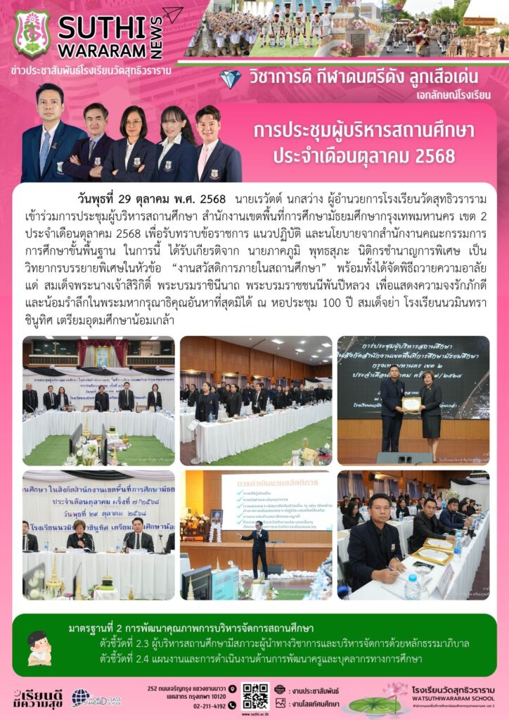การประชุมผู้บริหารสถานศึกษา ประจำเดือนตุลาคม 256829 ตุลาคม 2025Written by งานประชาสัมพันธ์ ยอดผู้เข้าชม : 11