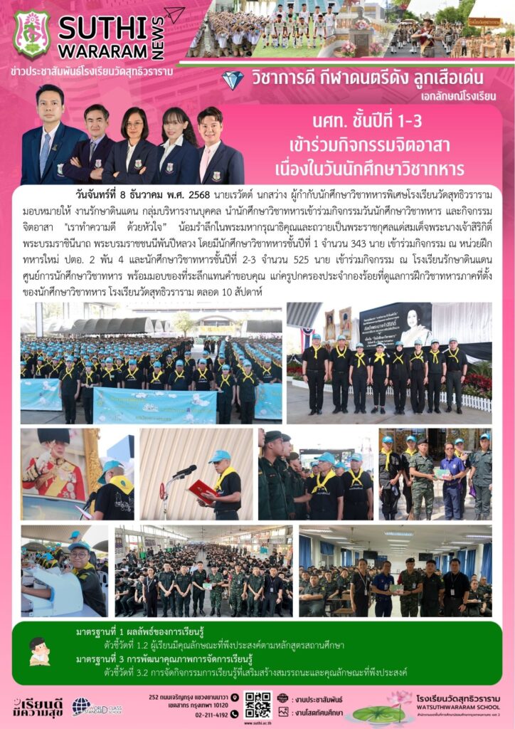นักศึกษาวิชาทหาร ชั้นที่ปี 1-3 เข้าร่วมกิจกรรมจิตอาสา เนื่องในวันนักศึกษาวิชาทหาร ณ โรงเรียนรักษาดินแดน ศูนย์การนักศึกษาวิชาทหาร8 ธันวาคม 2025Written by งานประชาสัมพันธ์ ยอดผู้เข้าชม : 42