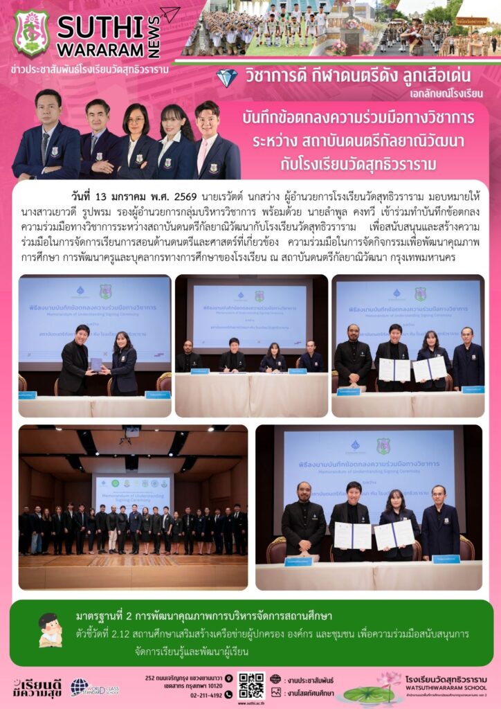 บันทึกข้อตกลงความร่วมมือทางวิชาการ ระหว่าง สถาบันดนตรีกัลยาณิวัฒนา กับ โรงเรียนวัดสุทธิวราราม13 มกราคม 2026Written by งานประชาสัมพันธ์ ยอดผู้เข้าชม : 17