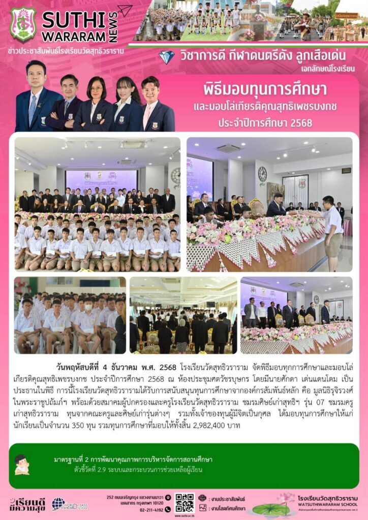 พิธีมอบทุนการศึกษา และมอบโล่เกียรติคุณสุทธิเพชรบงกช ประจำปีการศึกษา 25684 ธันวาคม 2025Written by งานประชาสัมพันธ์ ยอดผู้เข้าชม : 3