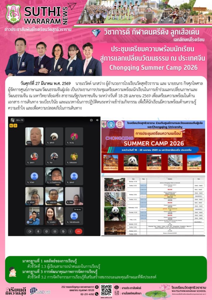การประชุมเตรียมความพร้อมนักเรียน สู่การแลกเปลี่ยนวัฒนธรรม ณ ประเทศจีน “Chongqing Summer Camp 2026”27 มีนาคม 2026Written by งานประชาสัมพันธ์ ยอดผู้เข้าชม : 4