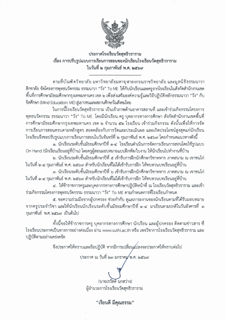 ประกาศโรงเรียนวัดสุทธิวราราม เรื่อง การปรับรูปแบบการเรียนการสอนของนักเรียนโรงเรียนวัดสุทธิวราราม ในวันที่ 2 กุมภาพันธ์ พ.ศ.256926 มกราคม 2026Written by กลุ่มบริหารวิชาการ ยอดผู้เข้าชม : 77