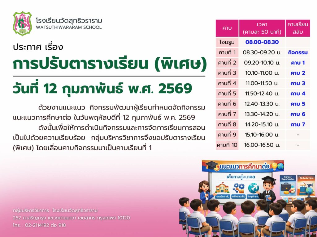 ประกาศ เรื่อง การปรับตารางเรียน (พิเศษ) วันที่ 12 กุมภาพันธ์ พ.ศ.25699 กุมภาพันธ์ 2026Written by กลุ่มบริหารวิชาการ ยอดผู้เข้าชม : 10