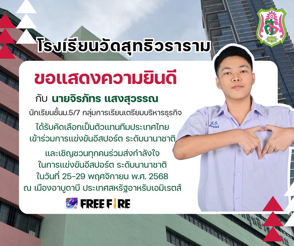 ขอแสดงความยินดีกับ นายจิรภัทร แสงสุวรรณ ได้รับคัดเลือกเป็นตัวแทนทีมประเทศไทย เข้าร่วมการแข่งขัน E-Sport ระดับนานาชาติ14 พฤศจิกายน 2025Written by กลุ่มบริหารวิชาการ