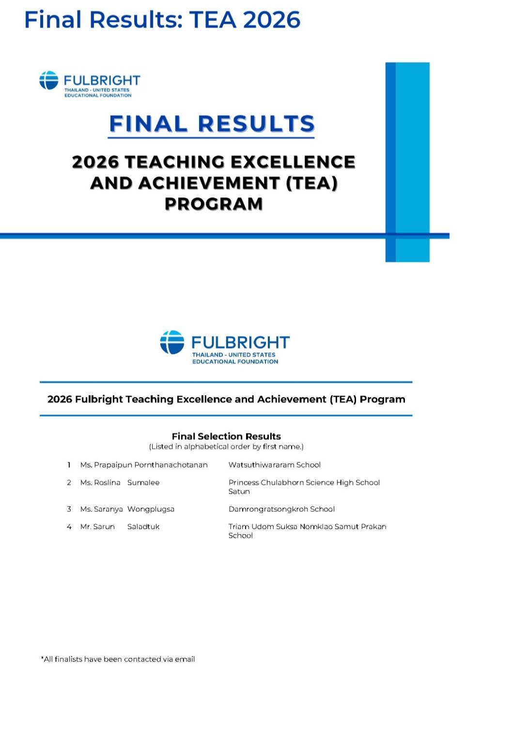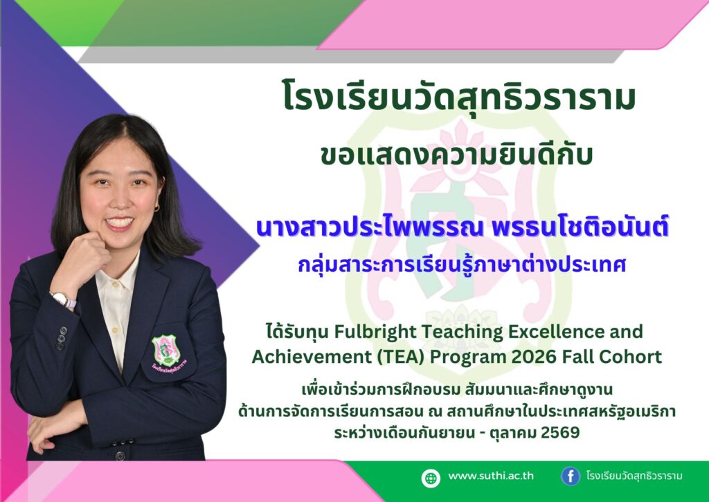 นางสาวประไพพรรณ พรธนโชติอนันต์ ได้รับทุน Fulbright Teaching Excellence and Achievement (TEA) Program 2026 Fall Cohort30 กันยายน 2025Written by กลุ่มบริหารงานบุคคล