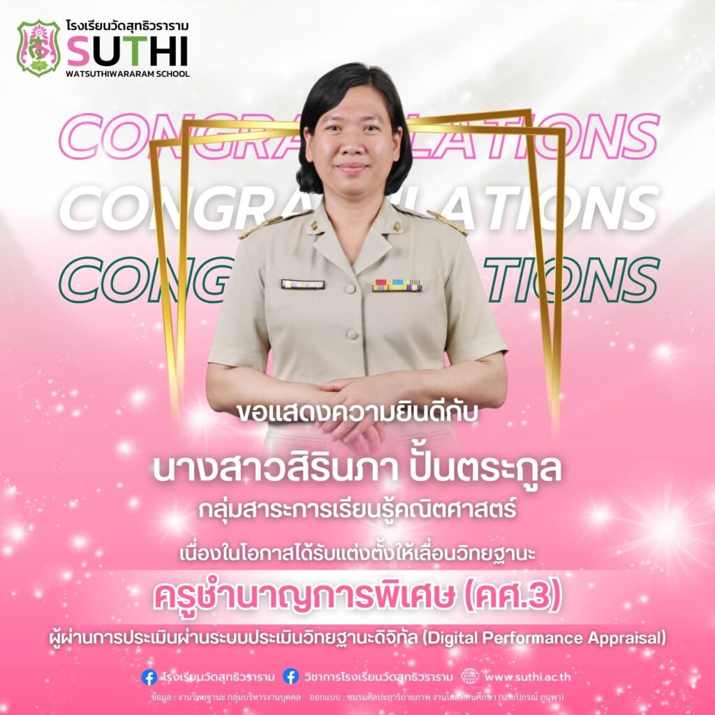3. นางสิรินภา ปั้นตระกูล ได้รับการแต่งตั้งให้เลื่อนวิทยฐานะผ่านระบบประเมินวิทยฐานะดิจิทัล (DPA) ครูชำนาญการพิเศษ (คศ.3)