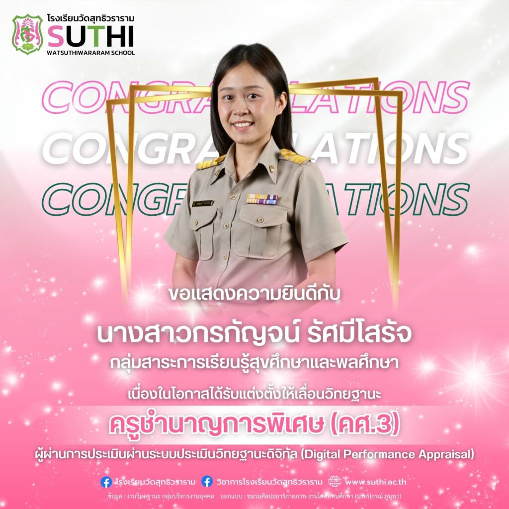 นางสาวกรกัญจน์ รัศมีโสรัจ ได้รับการแต่งตั้งให้เลื่อนวิทยฐานะผ่านระบบประเมินวิทยฐานะดิจิทัล (DPA) ครูชำนาญการพิเศษ (คศ.3)19 มีนาคม 2026Written by กลุ่มบริหารงานบุคคล ยอดผู้เข้าชม : 14